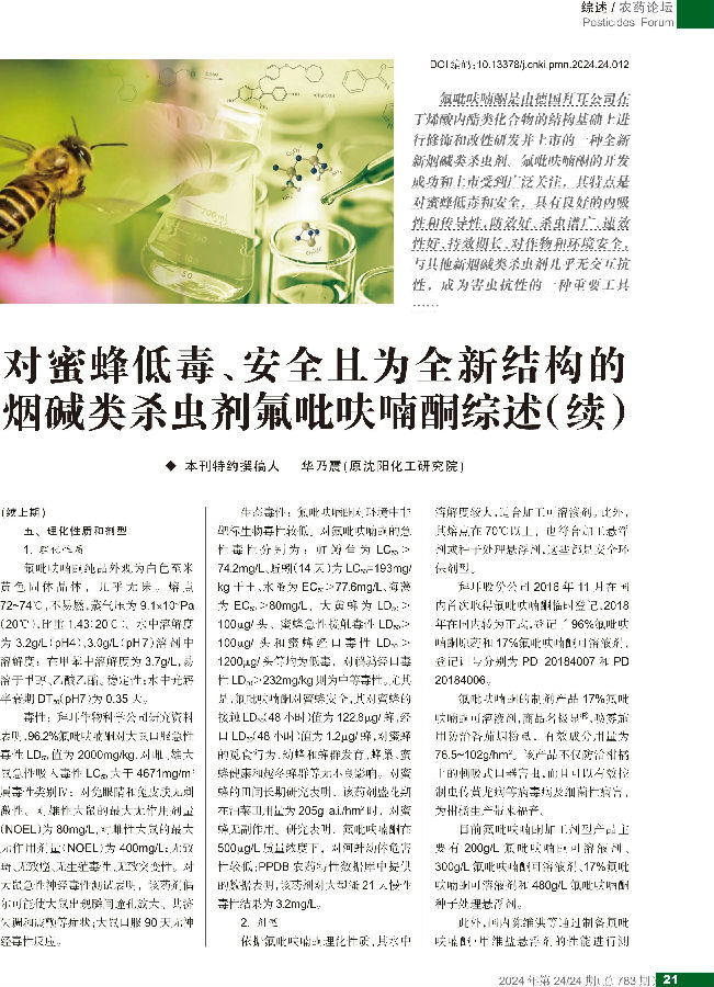 对蜜蜂低毒、安全且为全新结构的烟碱类杀虫剂氟吡呋喃酮综述