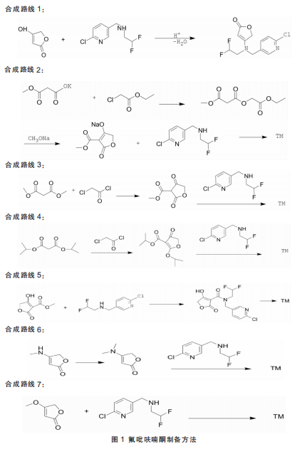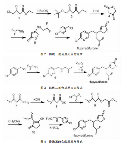 2. 刘瑞兵等科研人员据文献报道,介绍了3条合成氟吡呋喃酮的路线。