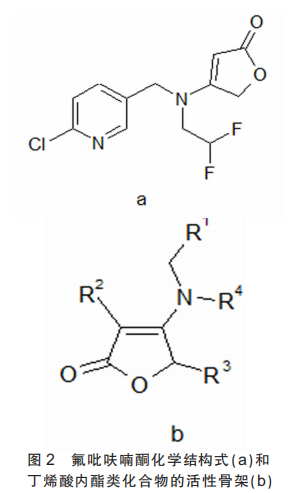 氟吡呋喃酮是丁烯酸内酯类化合物,该类化合物生物活性骨架见图2(b)。主要包含[R1-CH2-N]和3个不同的取代基R2、R3和R4。